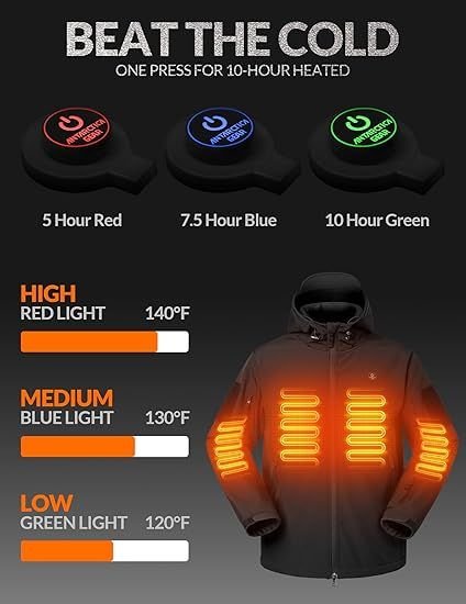 ��THREE HEATING LEVEL & DUAL CONTROL BUTTONS: 3 Heating levels (high, medium, and low). Change the heat setting of your jacket with a simple press of a button. Our battery can work up to 10 hours / 120℉ at a low level, 7.5 hours / 120℉ at a medium level, and 5 hours / 140℉ at a high level.