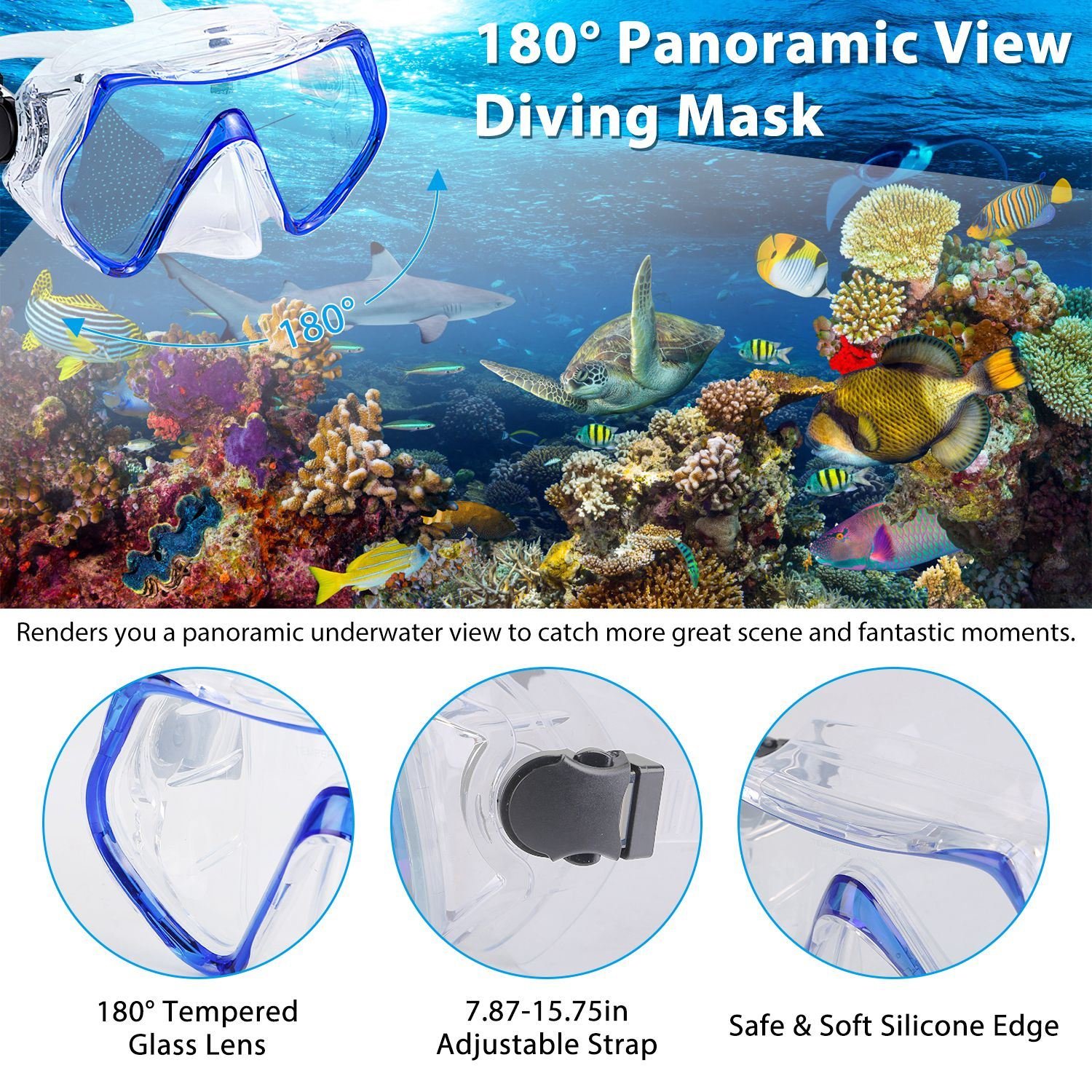 *180° Panoramic View Diving Mask*:Made of sturdy and super clear tempered glass and designed with 180° panoramic view lens,the two big-window mask renders you a panoramic underwater view to catch more great scene and fantastic moments and can withstand the water pressure while snorkeling and diving. Besides,the silicone edge is well sealed to avoid water leakage and makes the mask fit your face well,and the silicone straps can be easily adjusted for comfortable wear experience.